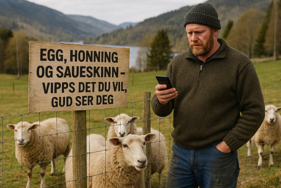 Vippsbua har vorte ein suksess blant bygdefolk og forbipasserande turistar som trur dei har funne “ekte lokal kultur”. I realiteten kjøper dei egg frå Rema og honning frå Sverige, men det står “heimelaga” på skiltet, og det er det viktigaste.