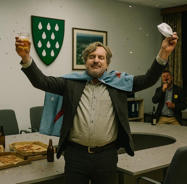BYKLE – Det byrja som eit stille minnemøte for det nyleg nedlagde levekårsutvalet. Ein kopp kaffi, eit par tørre kjeks og nokre nostalgiske sukk over gamle vedtak var det einaste på agendaen, men i løpet av få timar hadde stemninga snudd. Representantane gjekk frå dempa ettertanke til full feststemning, med dans på kontorpultar og konfetti i ventilasjonen. Klokka 03:12 vart politiet varsla om høglytt Odd Nordstoga-musikk frå opprørde naboar og ei mystisk lukt som kunne minne om norsk furuskog iblanda politisk desperasjon.