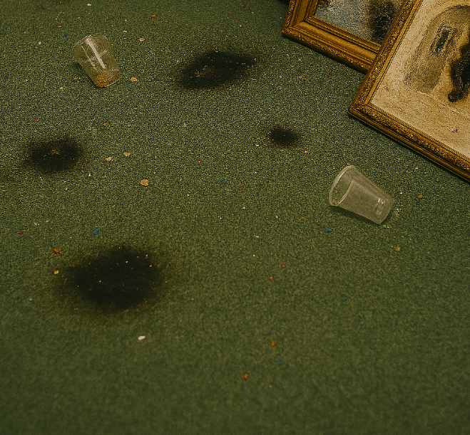 Då politiet kom, fann dei rådhuset i ein tilstand som best kan skildrast som «glitrande kaos». Ei mystisk lukt låg tungt over kommunestyresalen, og teknisk etat har no bede om ekstraordinære bevilgingar for å sanere romet. – Me har sett mykje, men dette var nytt, sa politibetjenten som var fyrst på staden. – Det var fleire svihol i teppet og cider i stoltrekka, men stemninga var i det minste god! supplerar han, og noterar «henlagt» på blokka si medan han tek handjerna av ordføraren.