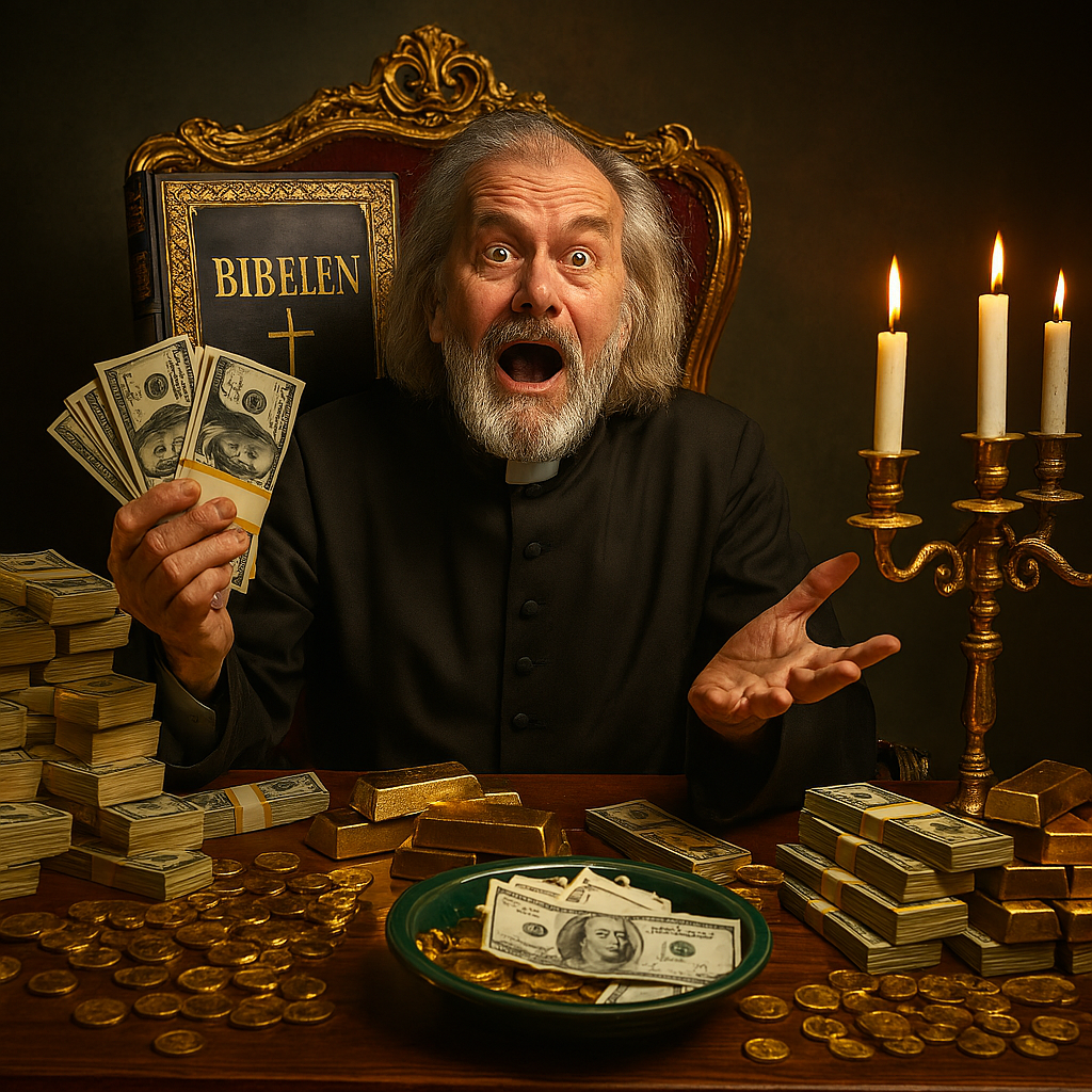 Lat oss heller ikkje gløyme Paulus, som sa: “Gud elsker en glad giver.” Og eg elskar ein gjevar med fast trekk. For kva er vel meir kristent enn å gjeve frå sin magre pensjon til ein som treng det meir – som til dømes ein prostdiakon med Tesla-leasing og behov for nytt pipeorgel i stova?