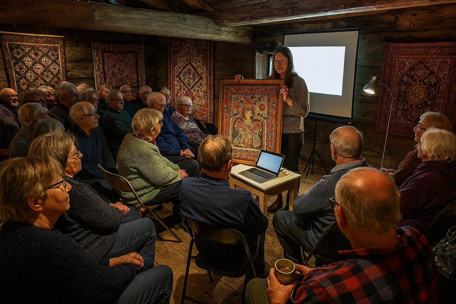 — Me hadde sett fram 12 stolar og ein termos, seier ein representant frå arrangørane som måtte springe heim og hente både klappstolar og naboen sin Moccamaster. — Me hadde ikkje forventa at så mange ville høyre om vevde løparar frå 1700-talet. Men her i Valle har folk mykje fritid og dårleg Internett.